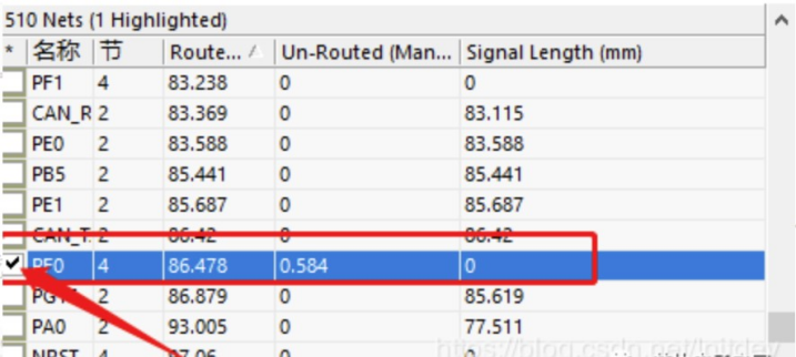 彈出的界面中,單擊一下<All Nets>。這時(shí)候會出來很多的net名稱。我們看著Un-Rout...這一欄,用鼠標(biāo)滾輪進(jìn)行查找數(shù)值不為零的選項(xiàng)。好,這里找到之后,把最前面的勾打上。