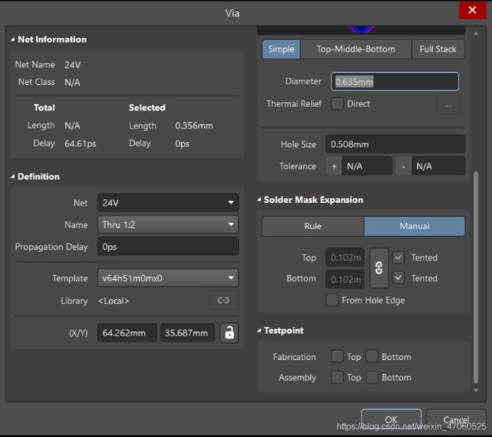 在AD中選中過孔,雙擊打開設置,選擇Solder Mask Expansion的Manual,將Tented打上勾即設置為過孔蓋油