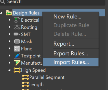 4. 打開一個(gè)需要導(dǎo)入規(guī)則的PCB文件,打開PCB規(guī)則及約束編輯器,在左邊規(guī)則項(xiàng)區(qū)域內(nèi)右擊,執(zhí)行Import Rules
