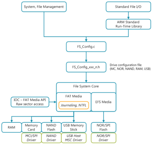 文件系統核心:處理低級的輸入和輸出文件操作(有些被重新定位為使用ARM標準實時運行庫)。根據配置設置,它使用適當的文件系統(FAT或EFS)并實現NAND Flash轉換層。