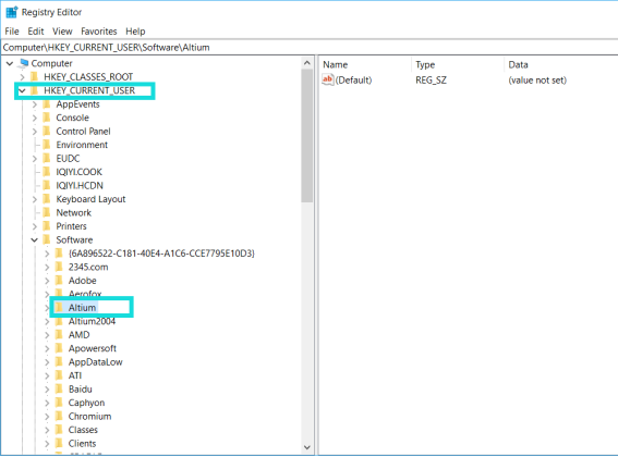 瀏覽?HKEY_CURRENT_USERSoftwareAltium,刪除有關altium designer 的有關注冊表信息,如下圖: