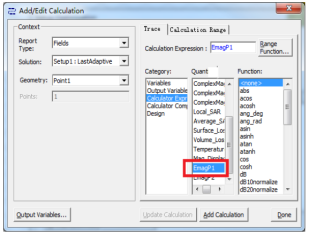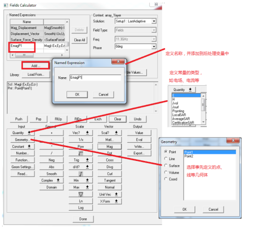 首先,通過菜單 HFSS—>Fields—>Calculator,打開場計算器,選擇需要觀測的點、或線等幾何體,通過公式編輯設置自定義場量;