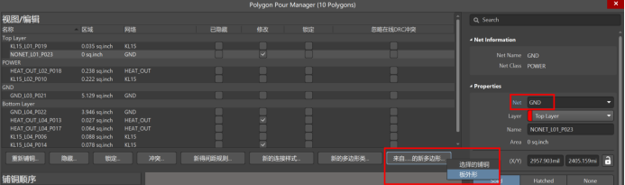 打開鋪銅管理器。執行菜單中的“工具”——“鋪銅”——“鋪銅管理器”命令,在鋪銅管理器中點擊“來自……的新多邊形…”按鈕,選擇“板外形”選項,然后在右邊鋪銅屬性對話框中設置鋪銅屬性,之后點擊“應用”,再點擊“確定”即可完成整板鋪銅。