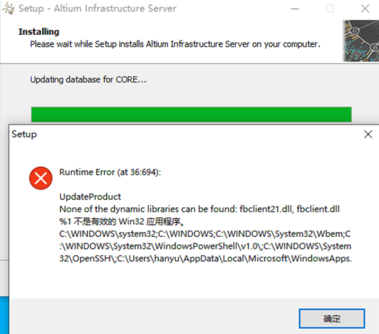 在服務器端安裝AIS時,當安裝程序運行至“Updating database for CORE”時跳出下圖報錯信息。