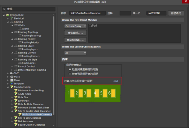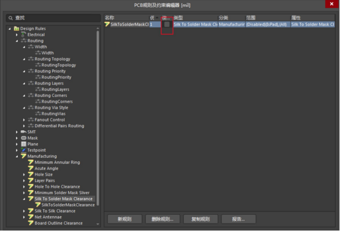 方法二.在設計(D)—規則(R),找到“Manufacturing"—“Silk To Solder Mask Clearance”,取消勾選(可以不改最小間距):