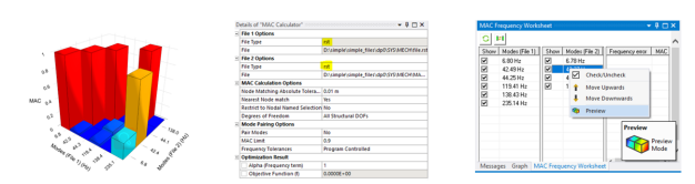 2. 添加了對 rst-rst 結果文件比較的支持,無需模型旋轉。啟用此選項是為了在引入設計更改(例如,材料、網格、接觸假設等)時識別計算模型中的模態變化,但不能識別全局定位方面的變化。MAC 計算器的其余功能繼續適用。