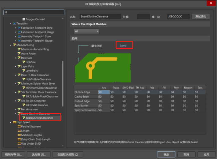 在Manufacturing-Board Outline Clearance中設置新規則,然后填寫想要設置的距離即可。
