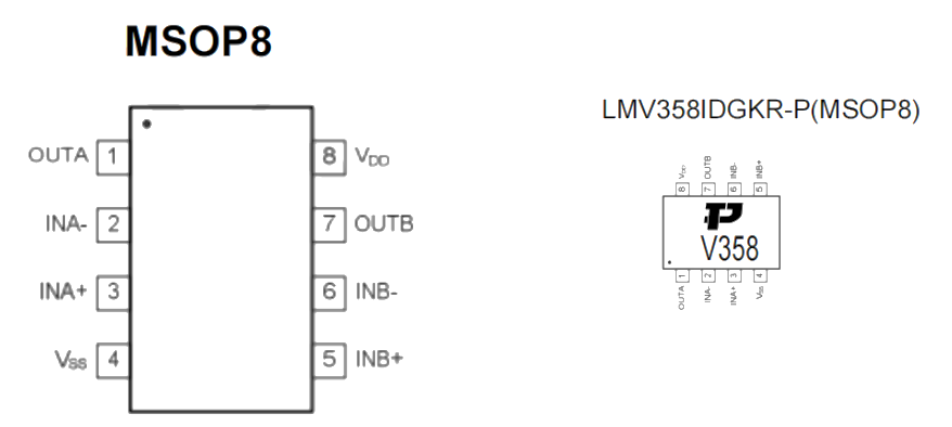 【 對(duì)照數(shù)據(jù)手冊(cè),管腳 7 為輸出管腳OUT2,管腳 6 和管腳 5 為輸入管腳IN1-和IN1+ 】