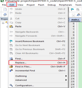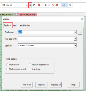 KEIL的替換功能可以在Edit->Replace...中打開,或者可以通過Find...按鈕進入Replace窗口,也可以直接用快捷鍵Ctrl+H進入。
