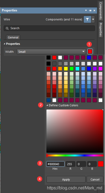 4. 最后更改屬性中的顏色值。可從列表中選定,也可以自定義輸入RGB值。