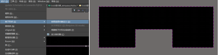 在設計菜單欄→板子形狀→按照選擇對象定義。