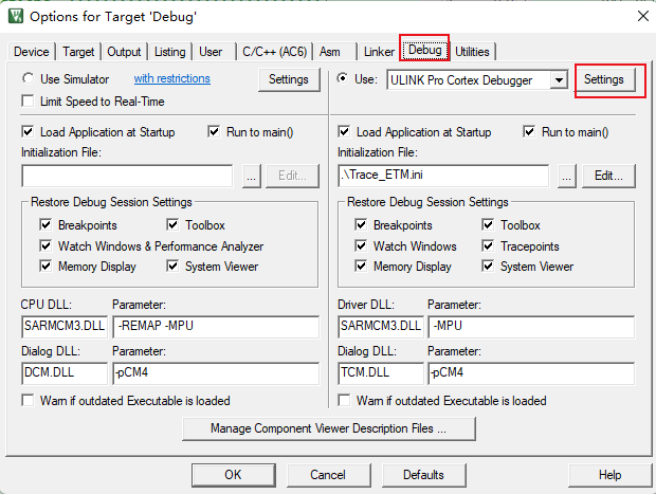 通過點擊options for target,選擇debug欄,點擊settings進入到設置欄中。