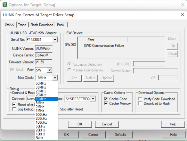 然后通過選擇Max Clock調整下載速度,注意這里最高的速度為50MHZ,但是可使用的最高下載速度是根據(jù)下載器所支持的最高下載速度來設定,超過下載器所支持的最高下載速度是無法使用的。