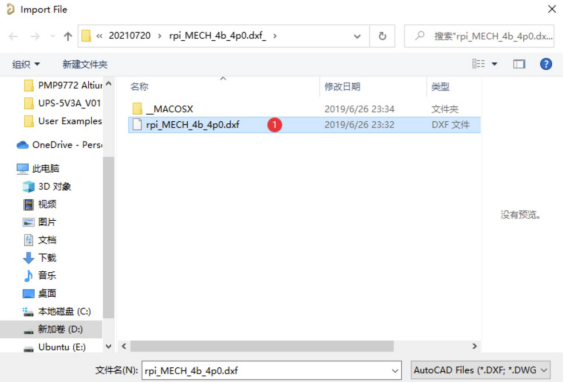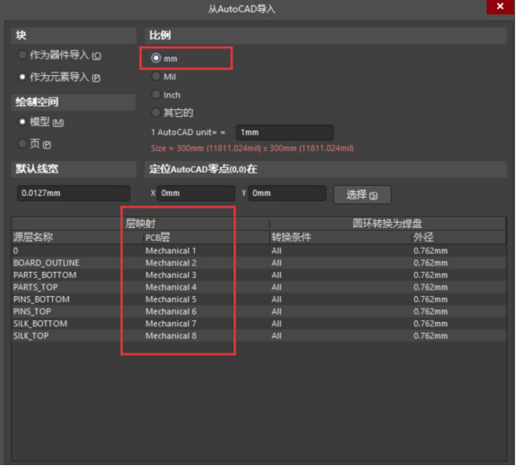 配置選項,將比例單位勾選為mm,將每個層都單獨層映射。這里將每個層都單獨層映射,是因為樹莓派提供的DXF信息過多,板框、絲印、焊盤、鉆孔都在這個文件中,不分層的話看起來非常凌亂。實際操作中,在確定內容的情況下,可以只導入板框和接插件的絲印。