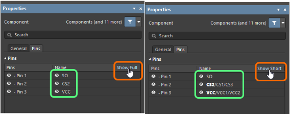 與前版本不同之處在這,在“Pin”選項(xiàng)卡上的屬性面板的“組件〞模式中,使用網(wǎng)格頂部的“Show Full/Show Short”來(lái)顯示或隱藏列出的所有引腳的備選引腳名稱(chēng)。