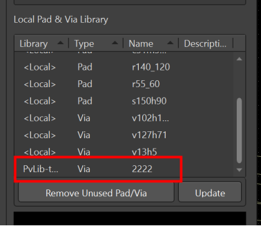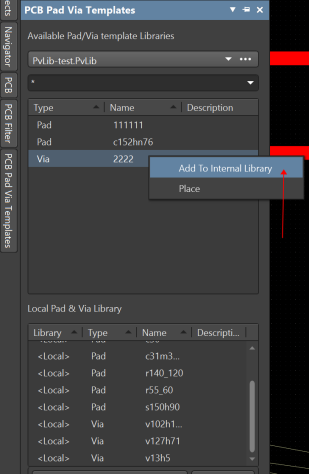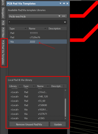 把Pvlib添加到項目中后還需要做一步操作。在PCB界面點擊右下角Panels,打開PCB Pad Via Templates,Via 2222為自己創建的過孔,下方Local Pad & Via Library為當前可使用的一些焊盤和過孔模板,在這里面沒有Via 2222,需要把2222添加進去。