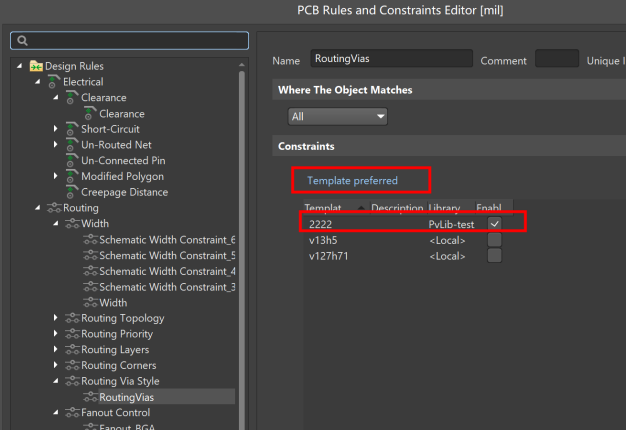 添加完之后,打開規則約束編輯器,找到RoutingVias,選擇Template preferred,就能看到被添加進去的Via 2222,打勾后就能正常使用這個過孔了。
