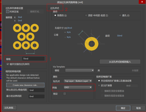 2. 在過孔樣式中設置過孔尺寸及網絡