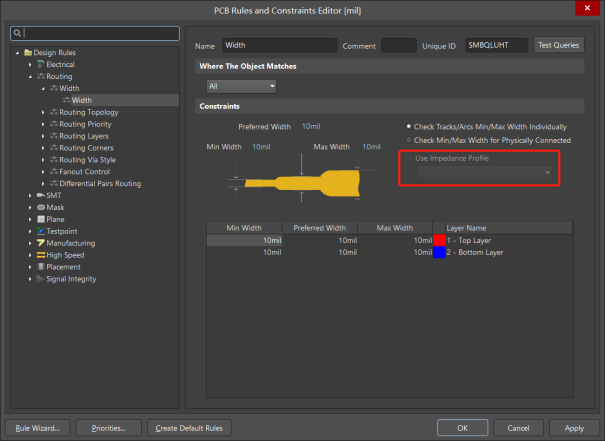 走線規(guī)則中不能調(diào)用阻抗配置文件,需要在層疊管理器中添加阻抗配置文件。