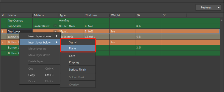 這里以六層板為例,在層疊管理器中添加信號(hào)層和平面層