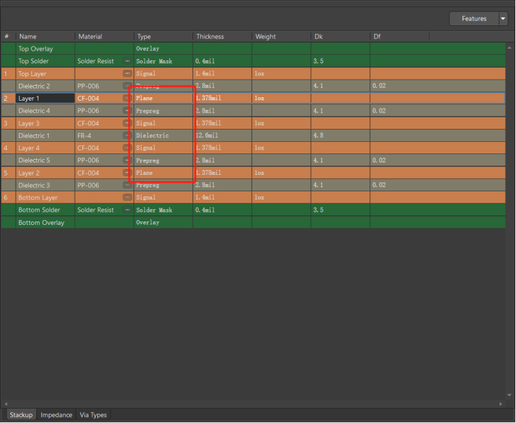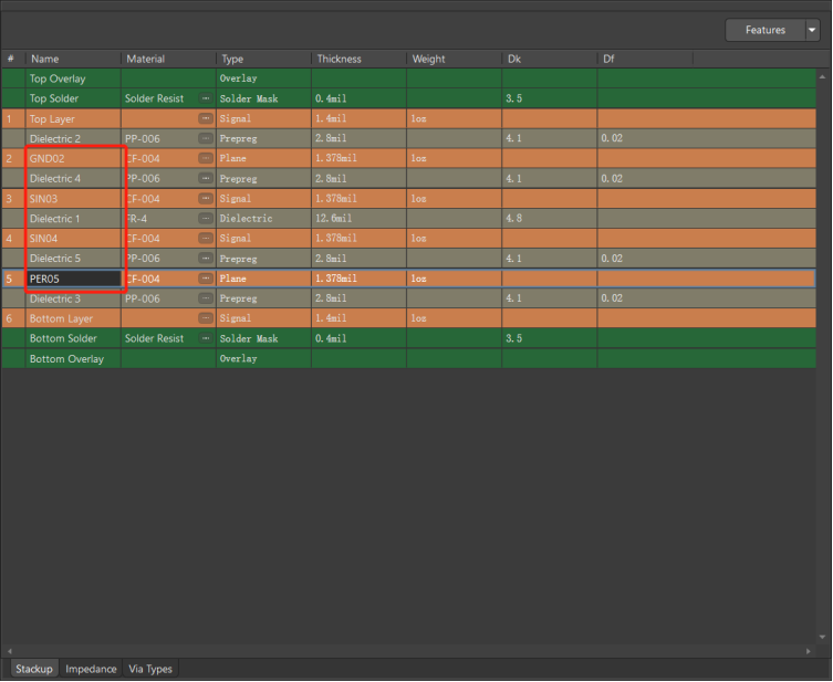 層的命名進(jìn)行修改(符合疊層的要求),對(duì)各層的厚度進(jìn)行相應(yīng)的修改,層厚也是阻抗配置的影響因素;