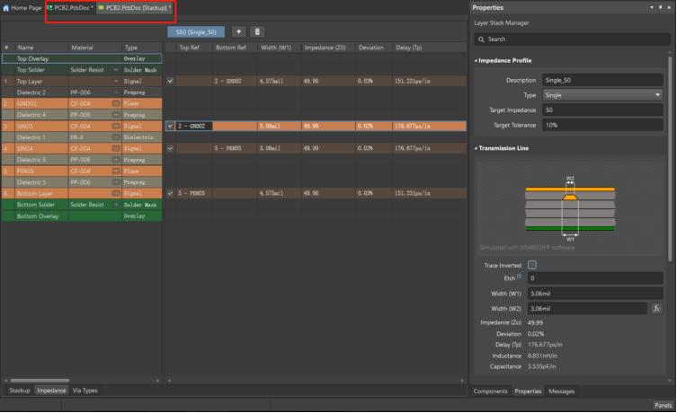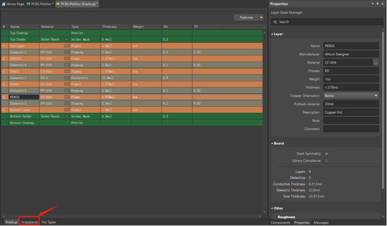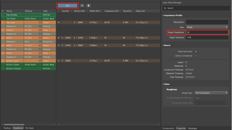 點(diǎn)擊層疊管理器中的【Impedance】,進(jìn)入阻抗配置;