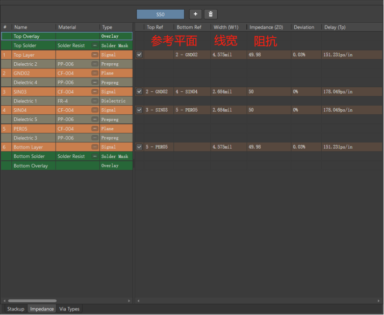 可以看到參考平面、線寬、阻抗等參數(shù);