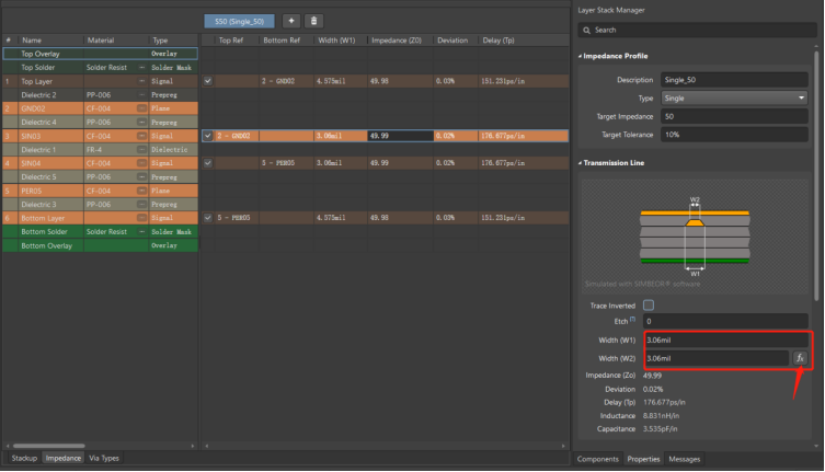 在屬性板中可以修改所需要的阻抗參數(shù);