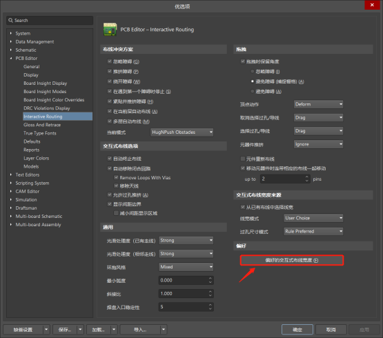 進入優選項下【PCB Editor】【Interactive Routing】的【偏好】,點擊【偏好的交互式布線寬度】。