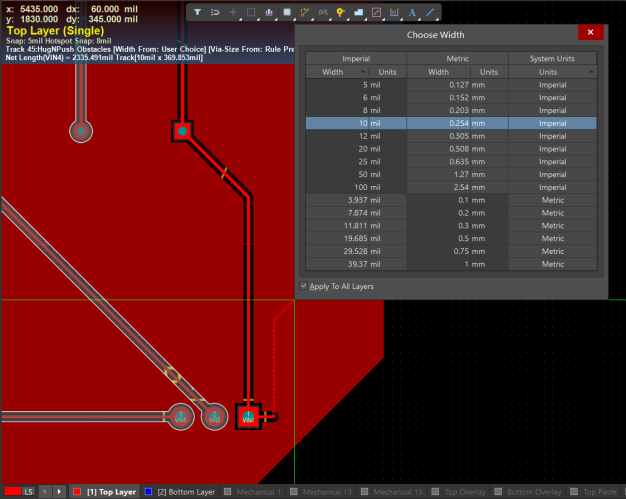 注:選擇目標布線寬度后,發現走線寬度并沒有改變,那是走線規則設置的問題,需要到規則中進行修改(將最大最小數值修改即可)。