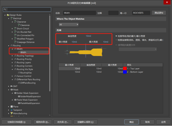 可以查看到預設的布線寬度,英制和公制相對應,可以更好的使用所需要的布線寬度。可以添加需要的線寬預設。