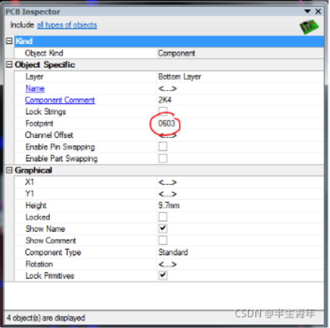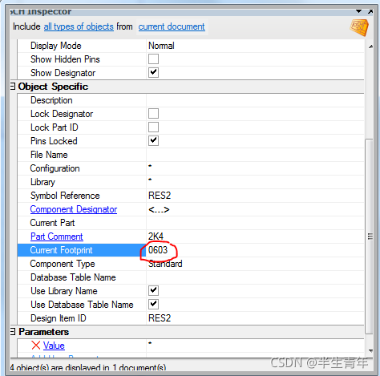 4. 在該頁面中找到封裝項Current Footprint 中封裝名為0603的,將其改為自己想要的封裝名(必須是封裝庫存在的);