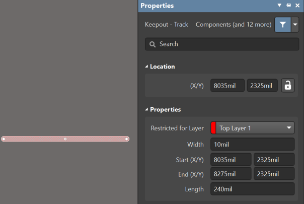 對于Keepout線,層的設置將決定該線對哪些層有效。通過層設置可以將Keepout線設置為Keep-Out層和當前PCB疊層結(jié)構中其他的布線層,并且顏色會變成對應層的顏色。如果設置在Keep-Out層,此線對所有布線層有效;如果設置為某一層(如Top),則只對當前層有效。