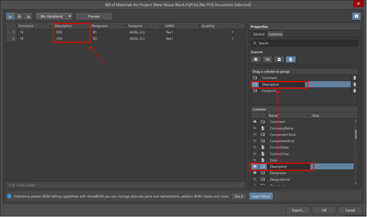 在BOM中此元器件的信息基本相同,但是Description對元器件的規格描述存在差異。默認打開BOM時,Description信息是不作為篩選條件的,如何添加為篩選條件,進行如下操作。