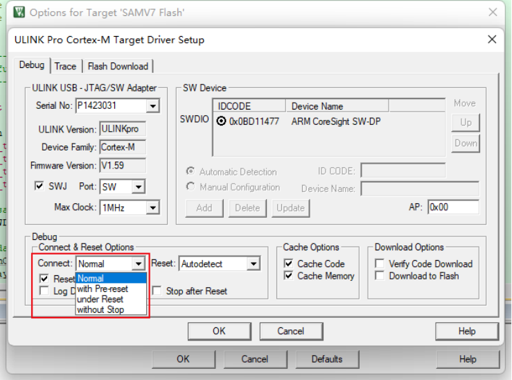 3、under Reset:在復位下,連接到設備時,硬件復位(HW Reset)信號保持激活狀態。當用戶程序錯誤禁用JTAG/SW接口時,使用此選項。