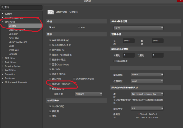 選擇Schematic中的General界面,然后取消勾選 使用GDI+渲染文本+