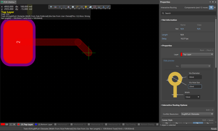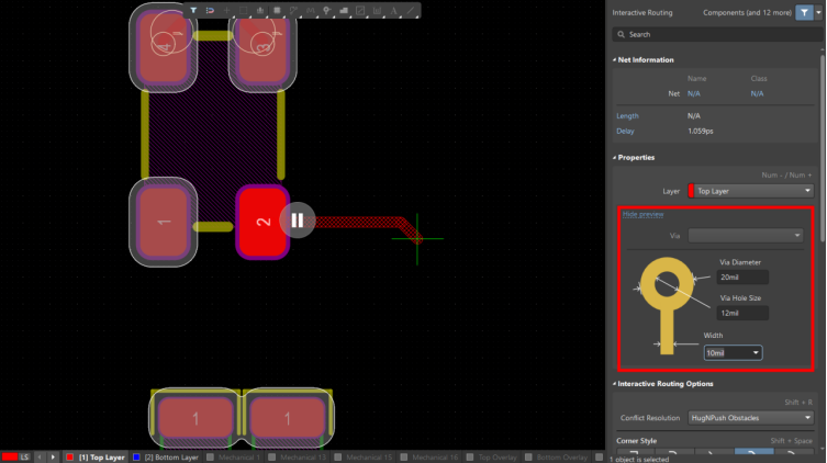 客戶遇到在走線過(guò)程,屬性板中調(diào)整過(guò)孔大小,重新輸入數(shù)值,無(wú)法改變過(guò)孔大小。嘗試修改過(guò)空大小后,發(fā)現(xiàn)數(shù)值修改只能在指定范圍內(nèi)。