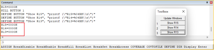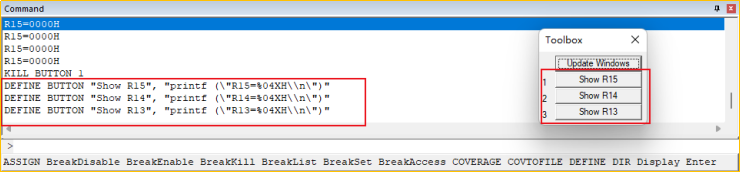 應用場景:在調試過程中,想自定義一些調試功能或者對于多種的調試命令想一鍵執行,可以通過下面的功能進行設置自定義調試按鈕。工具箱按鈕可以在任何時候單擊,甚至在運行測試程序時也可以單擊。