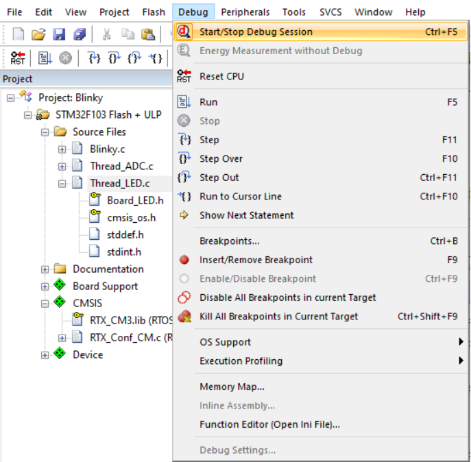 1 在菜單點(diǎn)擊 “Debug”-->“Start/Stop Debug Session”