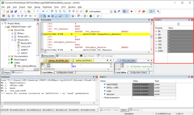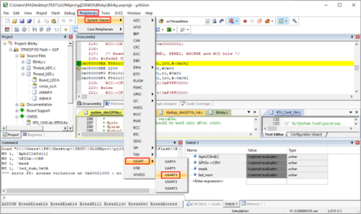 2 在調(diào)試界面中,打開(kāi)“Peripherals”--> “System Viewer”選擇一個(gè)外設(shè),比如USART--> USART1