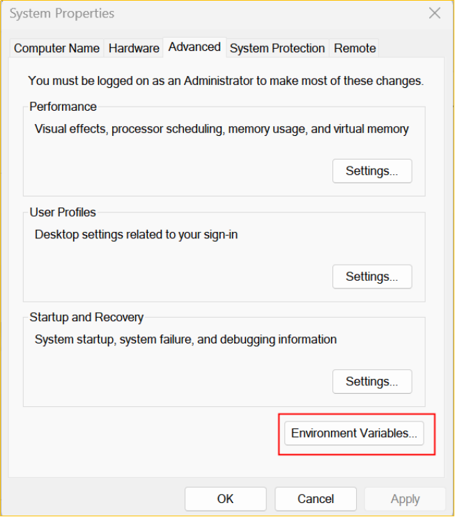 2)在系統屬性窗體中,選擇“Environment Variables...”,進行環境變量設置。