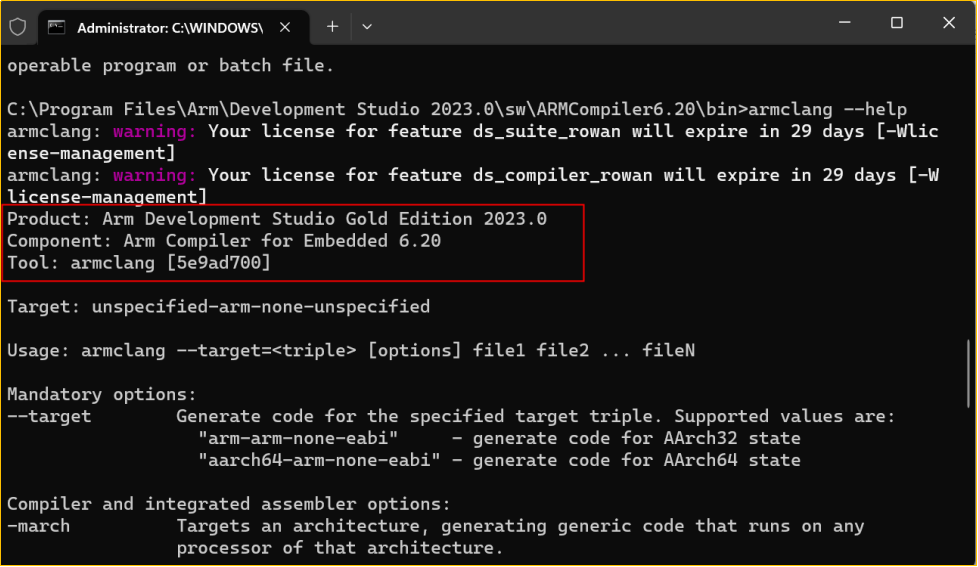 在 cmd 窗口中切換到arm 編譯器路徑,輸入編譯器名稱并回車。比如: armclang --help