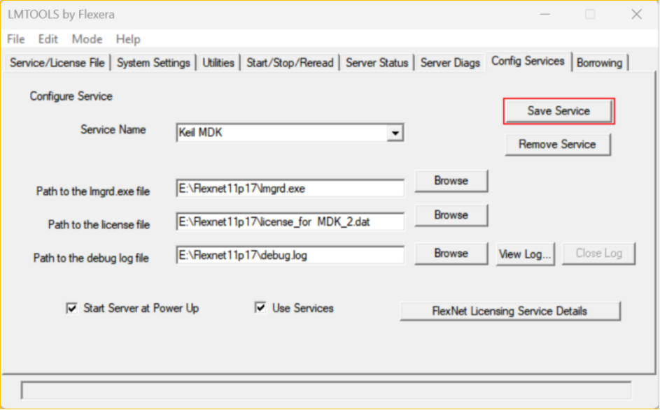 4)運行“l(fā)mtools”啟動Flexnet服務,點擊“Save Service”時,將不會再有報錯信息。