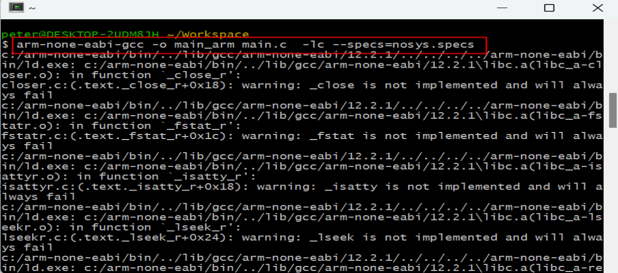 6)在工作目錄下,創建一個“.c”的Helloworld的源程序,通過“arm-none-eabi-gcc -o main_arm main.c -lc --specs=nosys.specs”編譯出可以執行文件,如圖4-6所示: