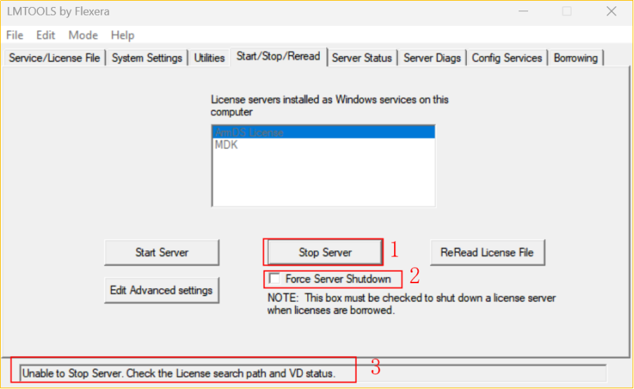 在需要關閉Flexnet管理軟件的服務時,提示“Unable to Stop Server...”的錯誤.
