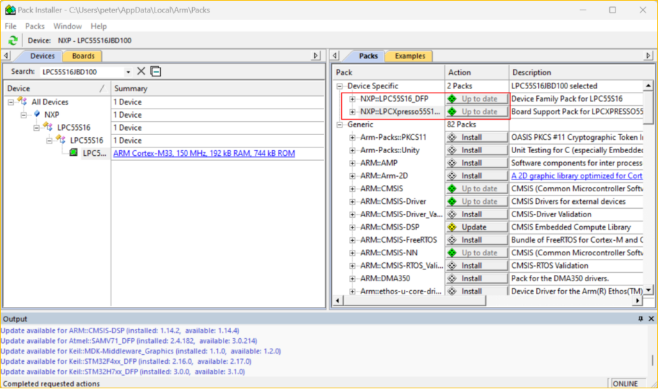 1)打開Keil MDK的Pack包管理器,選擇“NXP LPC55S16JBD100”處理器Pack菜單下,點擊“Up to date”更新一下開發板的Pack。
