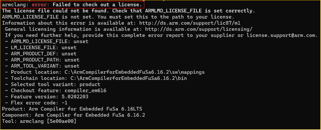 在使用FuSa Compiler6.16編譯的工程時,無法獲取授權,出現(xiàn)如下錯誤: