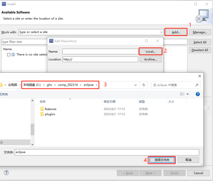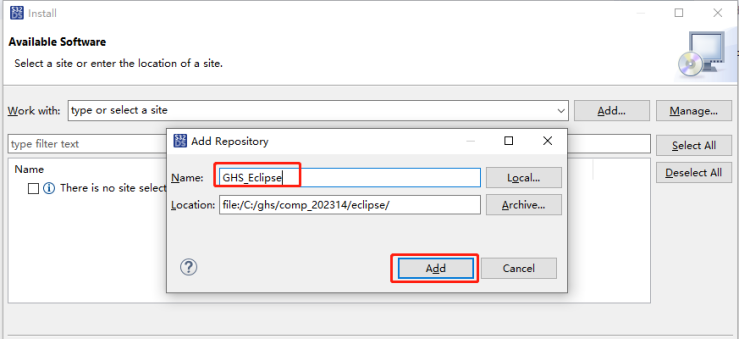 2 在Install對(duì)話框中點(diǎn)擊“Add”,之后在出現(xiàn)的“Add Repository”對(duì)話框中點(diǎn)擊“Local”.選擇GreenHills的編譯器的安裝目錄(例如:C:ghscomp_202314eclipse),點(diǎn)擊“選擇文件夾”。