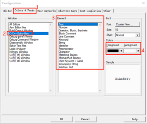 (2)在“Colors & Fonts”標簽下,window中選擇“C/++ Editor files”;Element中選擇不同的條目進行前景色(Foregruond)和背景色(BackGround)的設置。