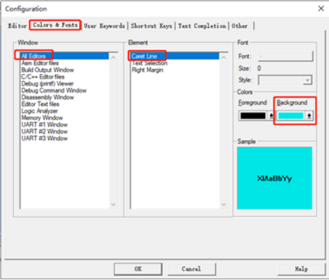 (3)在“Colors & Fonts”標簽下,window中選擇“All Editors”;Element中選擇“Caret line”(當前行);設置背景色和在上一步中設置的Text的前景色有一些區別。這樣就可以在選中這行的時候,文字都可以清楚的看到。